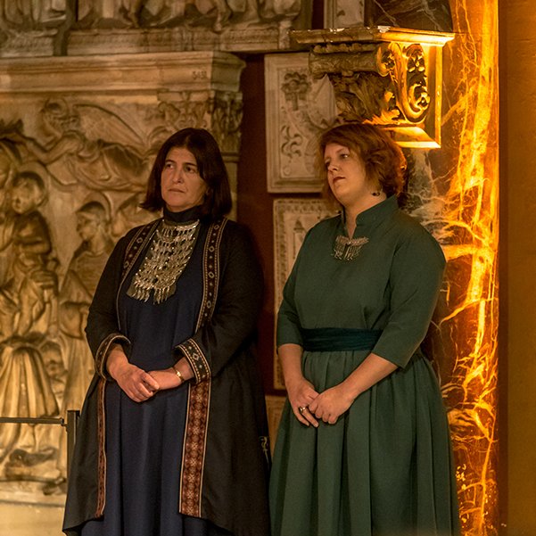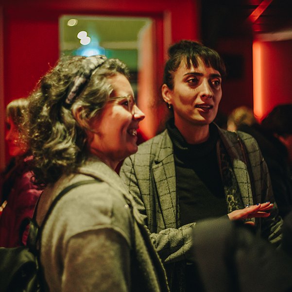 La Marraine Nana Ekvtimishvili et la directrice artistique du festival Brigitte Bouchard, lors du vernissage de l’exposition “Authentic Behaviour”, de l’artiste Maia Naveriani à l’Espace des Femmes.