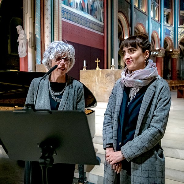 Nana Ekvtimishvili et Brigitte Bouchard, directrice artistique du festival, présentant le concert de Lisa Batiashvili et Giorgi Gigashvili à l’Eglise Saint-Germain-des-Prés.