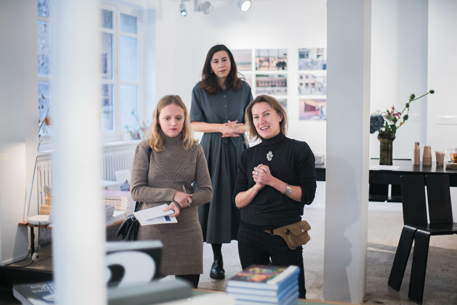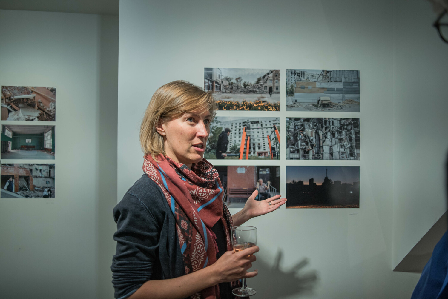Kateryna Radchenko devant ses photographies, issues de la série “Images Tell Stories. The Information Front.” à la Galerie Delpire & Co.