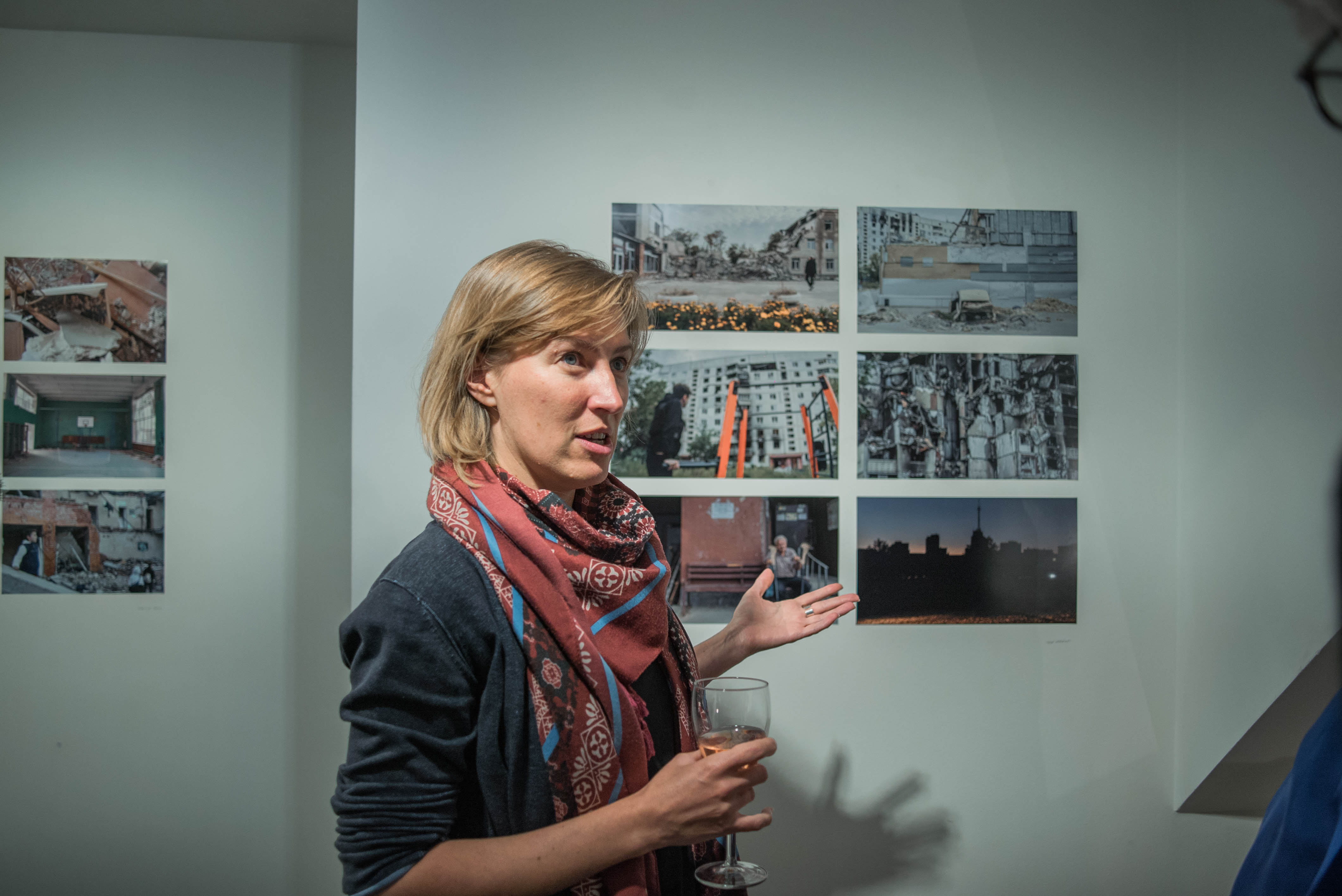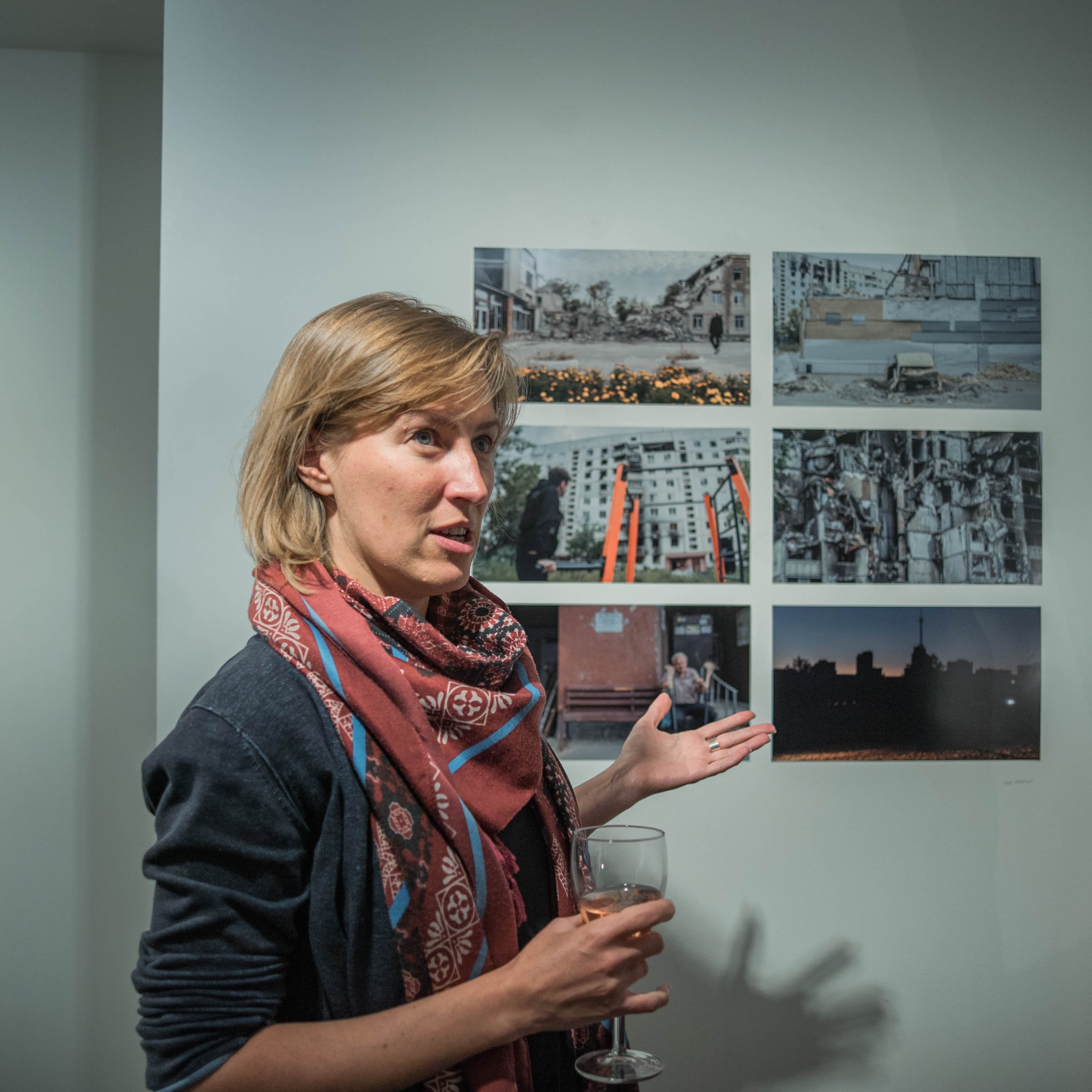 Kateryna Radchenko devant ses photographies, issues de la série “Images Tell Stories. The Information Front.” à la Galerie Delpire & Co.