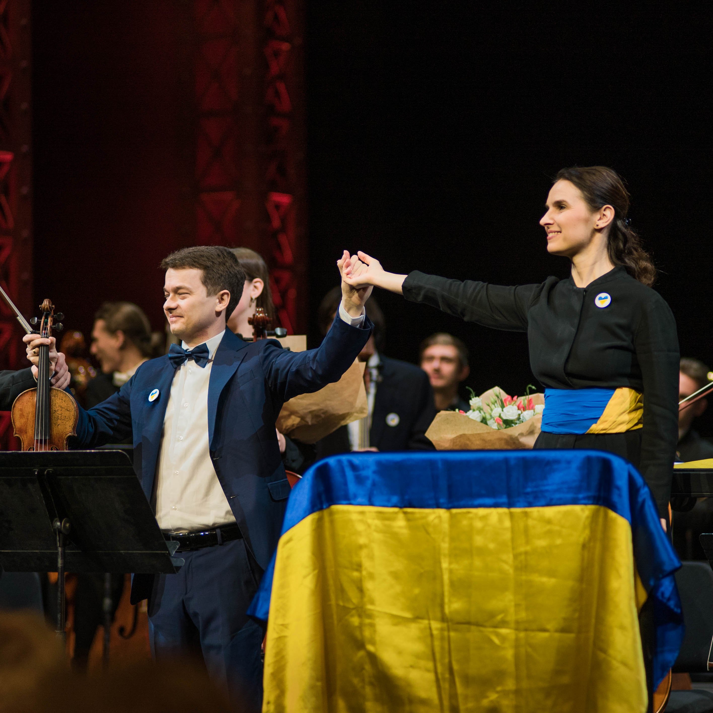 28 / 11 / 22 : Soirée de clôture du Festival au Théâtre du Châtelet. Oksana Lyniv, cheffe de l’Orchestre Symphonique des Jeunes d’Ukraine et et les violons solistes Andrii Murza et Aleksey Semenenko.