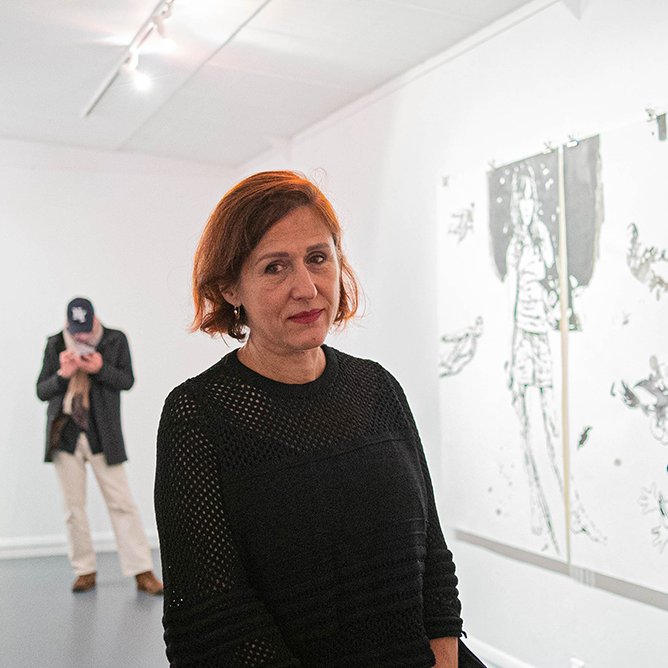 25 / 11 / 21 : Nina Kovacheva lors du vernissage de son exposition de dessins The Marriage of Heaven and Hell, à la Galerie du Crous