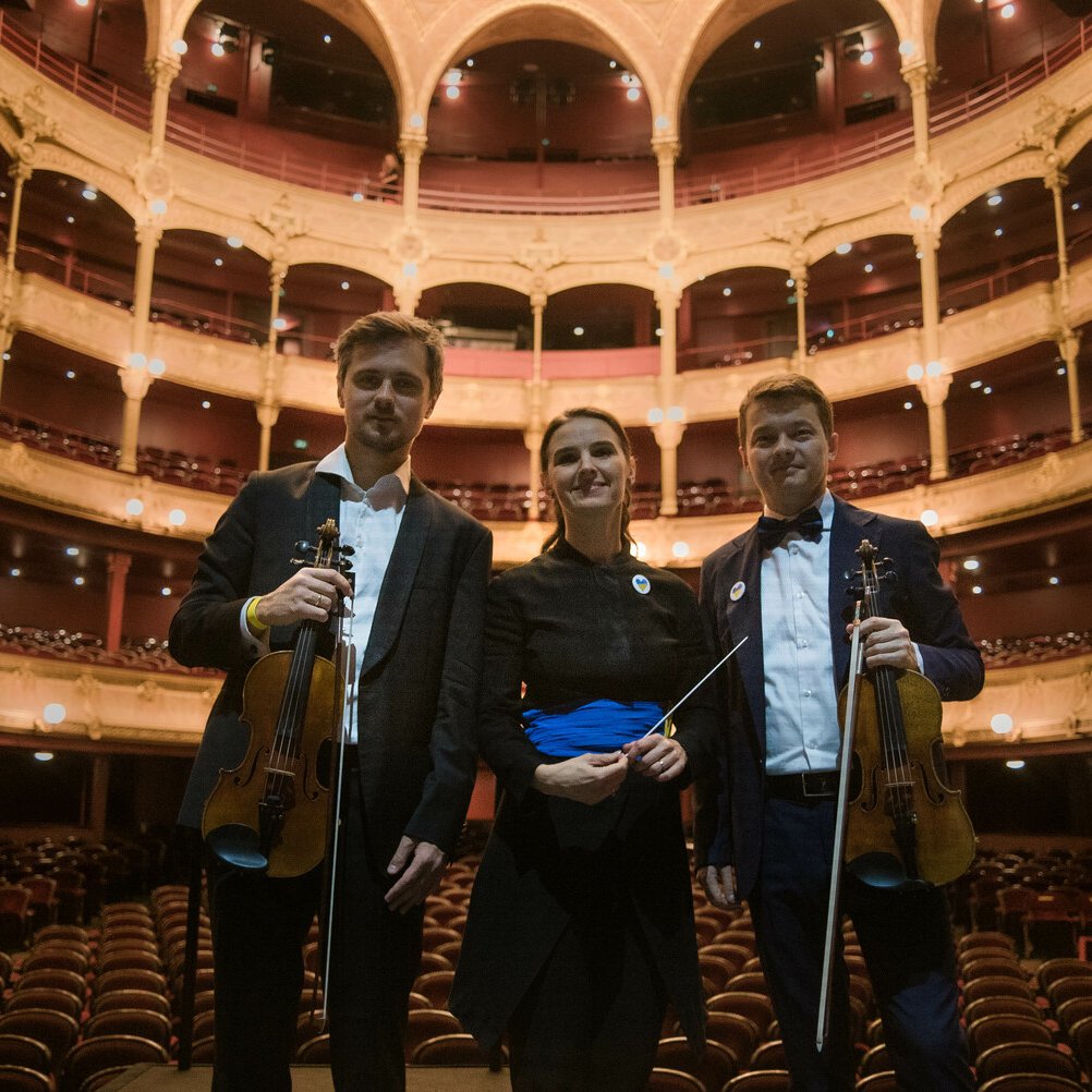 28 / 11 / 22 : Soirée de clôture du Festival au Théâtre du Châtelet. Oksana Lyniv, cheffe de l’Orchestre Symphonique des Jeunes d’Ukraine et et les violons solistes Andrii Murza et Aleksey Semenenko.