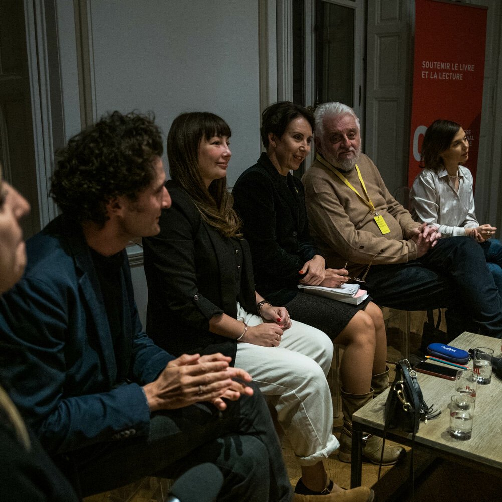 Kateryna Babkina, Irena Karpa, Boris Khersonsky, Emmanuel Ruben, Iryna Dmytrychyn et Marie-Madeleine Rigopoulos lors d’une rencontre autour du ivre “Hommage à l’Ukraine” au CNL.