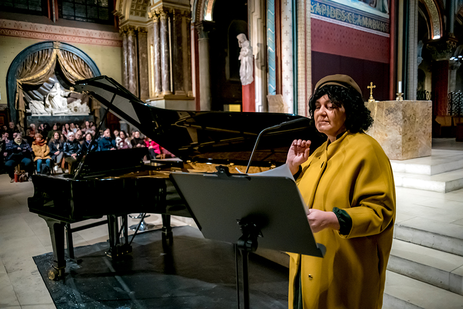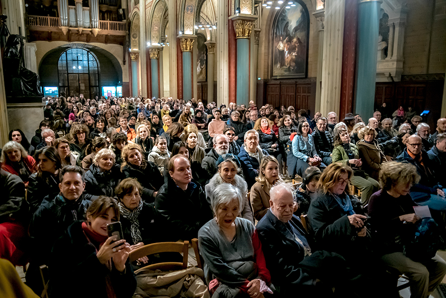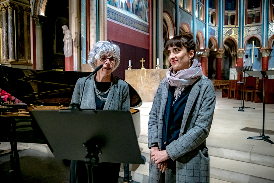Nana Ekvtimishvili et Brigitte Bouchard, directrice artistique du festival, présentant le concert de Lisa Batiashvili et Giorgi Gigashvili à l’Eglise Saint-Germain-des-Prés.